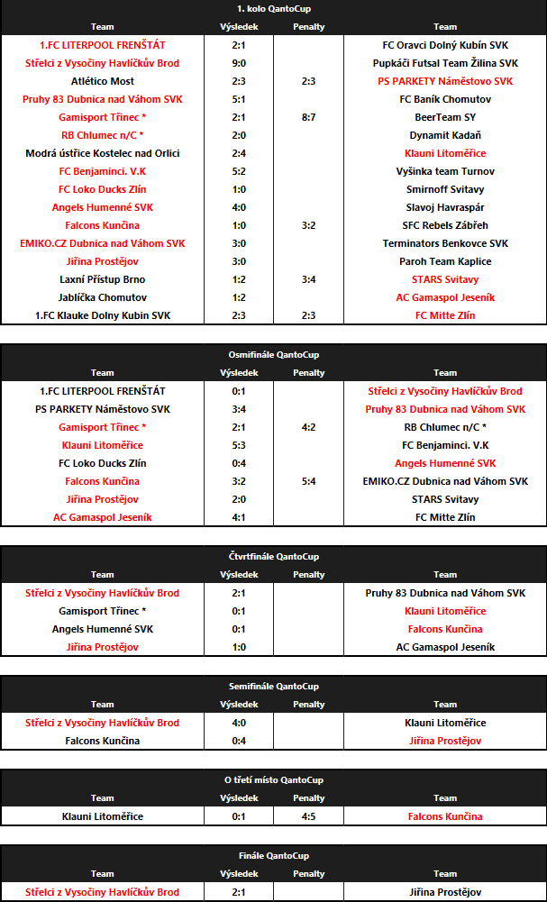 Finalový pavouk začal po důsledném počítání semifinálových skupin po jedné hodině odpolední 16 zápasy 1. kola. Finalové zápasy začali před pátou hodinou odpolední, kdy o třetí místo se v penaltovém rozstřelu utkali týmy Klauni Litoměřice vs. Falcons Kunčina. Ve finalovém zápase vyzval tradiční účastník QantoCupu Jiřina Prostějov tým Střelců z Vyšočiny Havlíčkův Brod. Po napínavém průběhu se na putovním poháru objeví premiérově Střelci z Vysočiny Havlíčkův Brod, kteří Jiřinu Prostějov udodali 2:1. Třetí místo obsadil tým Falcons Kunčina, který v penaltovém rozstřelu porazil Klauny z Litoměřic 5:4